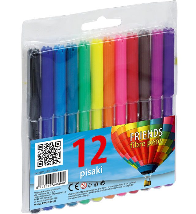 Pisaki 12 kol. FRIENDS to zestaw kolorowych pisaków, idealny dla dzieci i dorosłych, którzy cenią sobie kreatywność i różnorodność kolorów. W skład zestawu wchodzi 12 różnokolorowych pisaków, które umożliwiają tworzenie żywych, intensywnych rysunków. Każdy pisak ma wygodny, ergonomiczny kształt, który zapewnia komfort podczas długotrwałego rysowania.