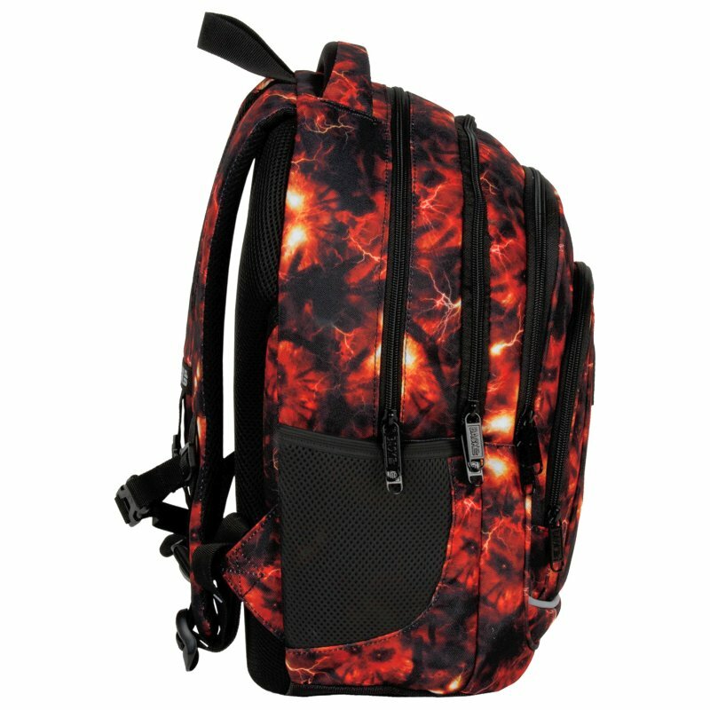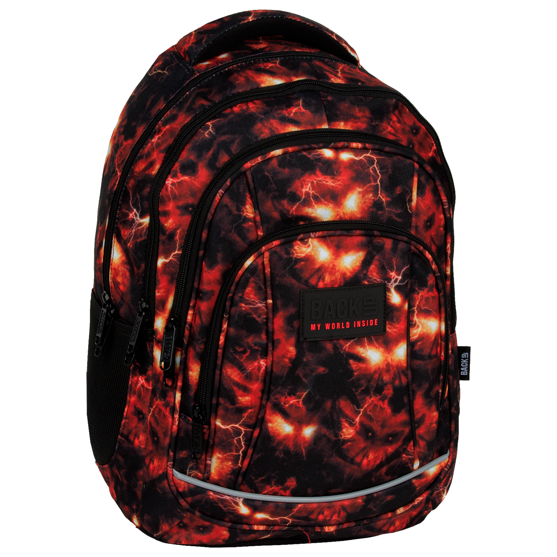 Portal do innego uniwersum, w którym drapieżne stwory robią wszystko, aby przejść do naszego świata. Czarne oczy potworów złowieszczo spoglądają z materiału, a ich ogniste twarze i okalające je pioruny dodają mrocznego, grungowego charakteru. Czerń suwaków i zamków potęguje efekt. Ten plecak szkolny to coś dla fanów fantastyki, w której zwykli bohaterowie stają przed wyzwaniem ocalenia świata przed złem z innego wymiaru.