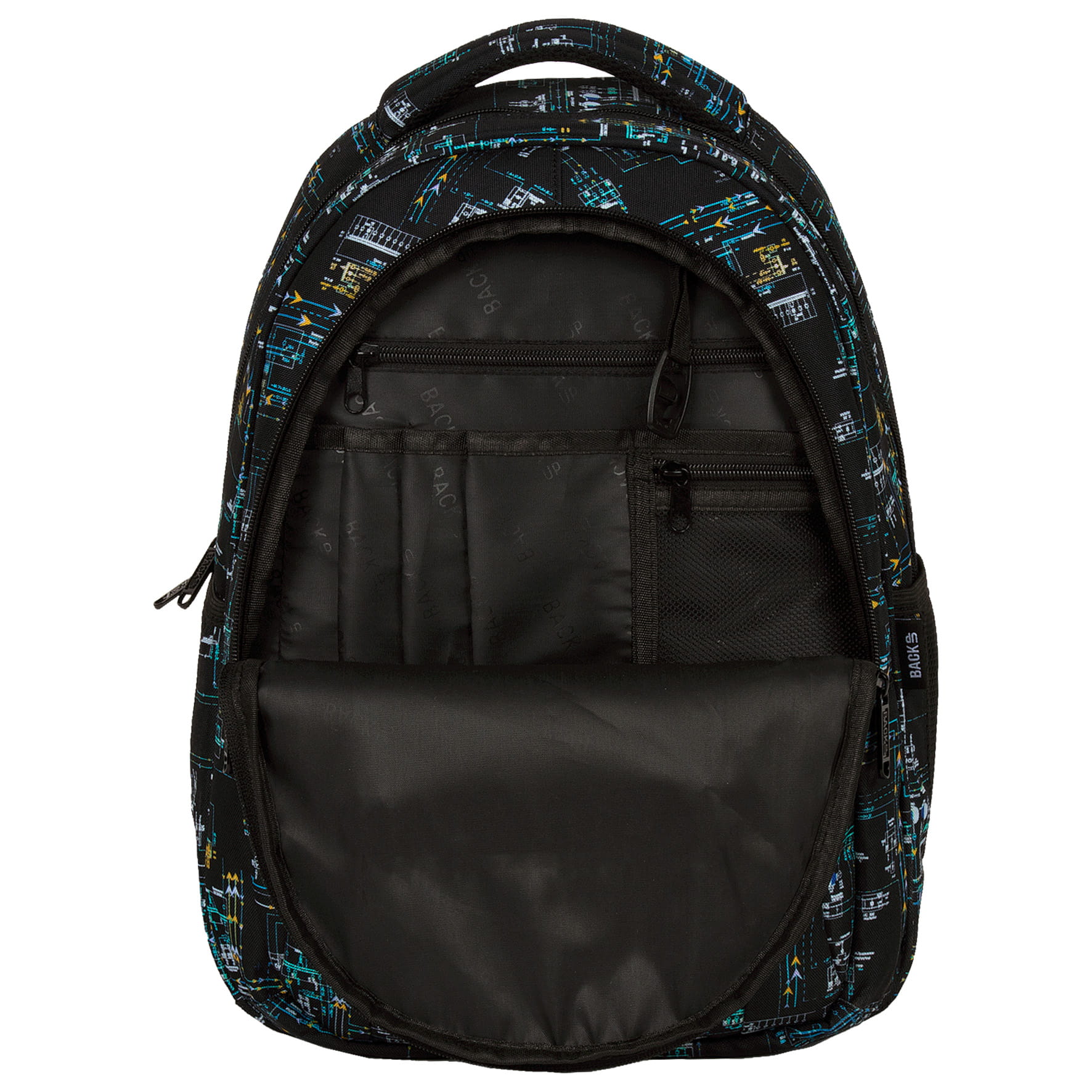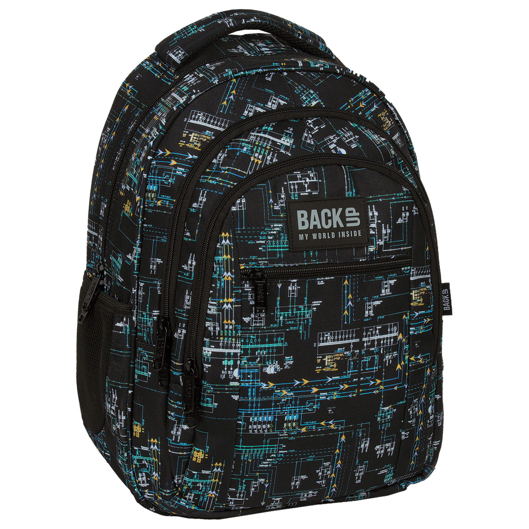 Układ połączeń i przewodów, niczym małe miasto stworzone z elektrycznych elementów. Drobne korytarze w kolorach żółci, zieleni i błękitu składają się w labirynt, który przypomina wnętrza najnowocześniejszych komputerów. Wszystko to skomponowane na czarnym tle materiału i zwieńczone czarnymi suwakami i zamkami. Minimalistyczny, a jednak przyciągający wzrok plecak młodzieżowy, który zafascynuje miłośników digitalowego świata.