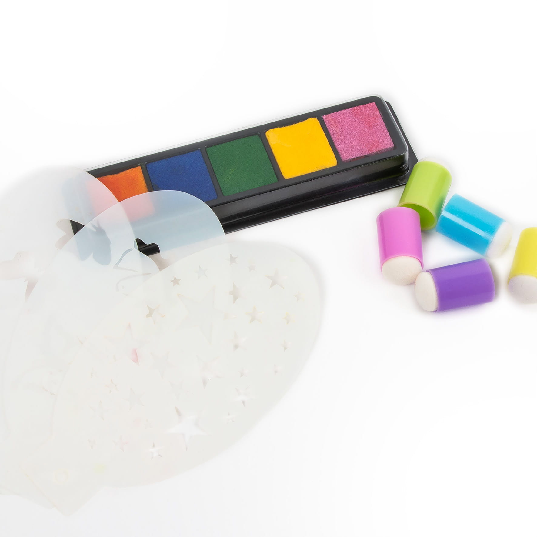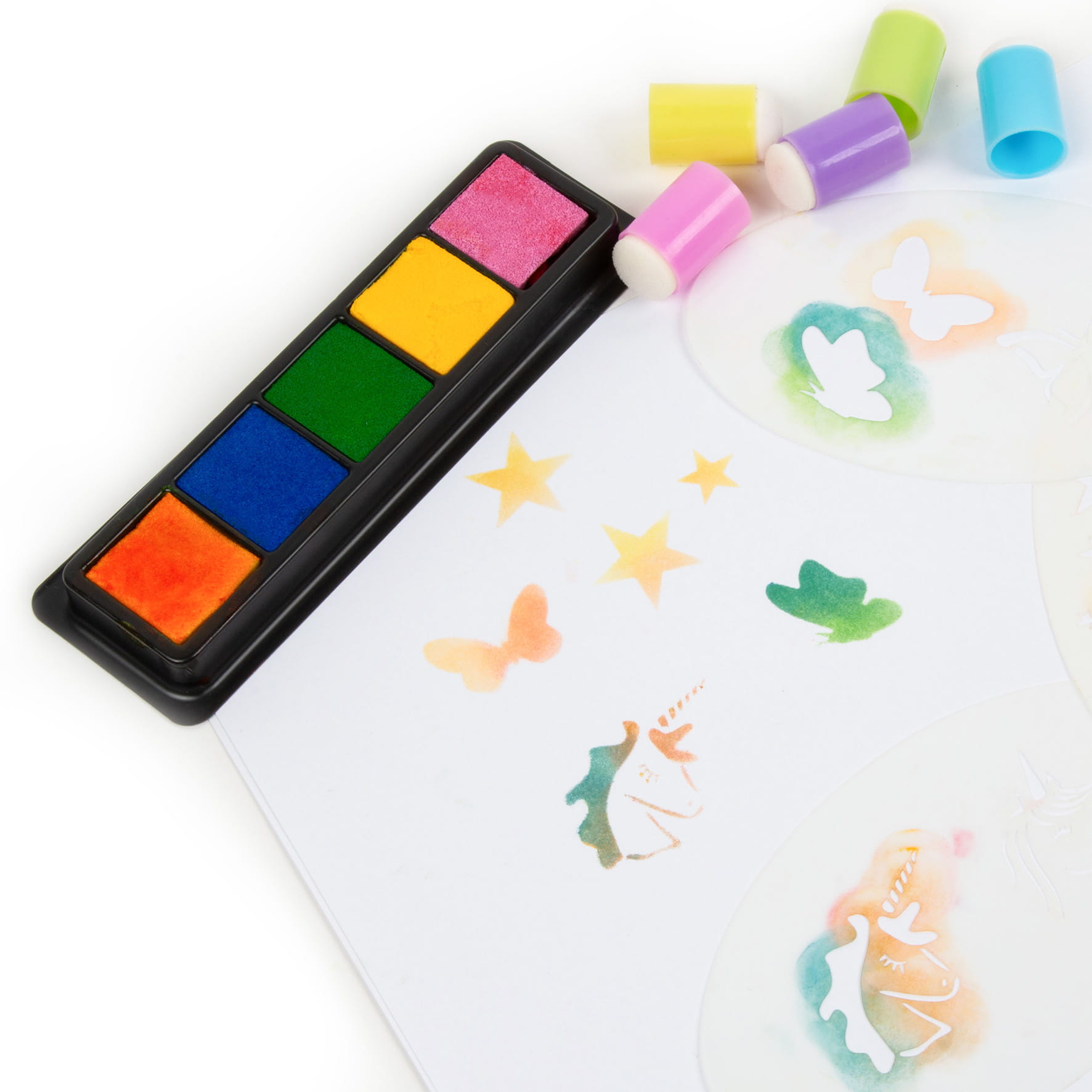 Stempelki dla dzieci z szablonami i aplikatorami z gąbeczką. Pięć kolorów atramentu: różowy, pomarańczowy, żółty, zielony i niebieski można mieszać i cieniować ze sobą za pomocą aplikatorów, tworząc jedyne w swoim rodzaju wielobarwne obrazki, w których kolory magicznie się przenikają. Szablony z różnymi ciekawymi wzorami pozwalają na przeniesienie na papier fantazyjnych historii. Stempelki wzbogacą każdą pracę plastyczną oraz będą świetnym prezentem dla kreatywnego malucha.