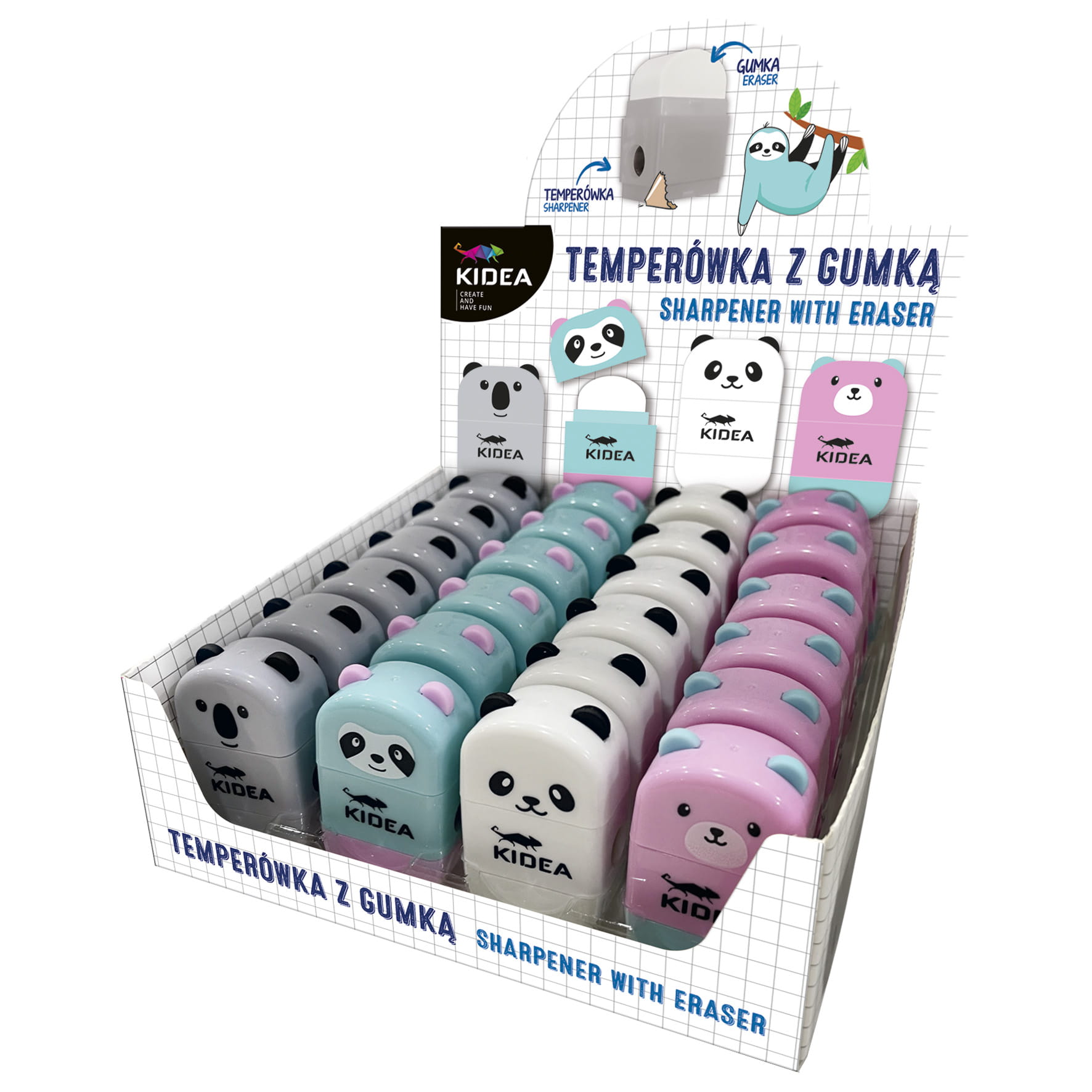 Urocza temperówka z gumką w kształcie słodkiego misia. Do wyboru aż 4 wzory i pastelowe kolory: panda, leniwiec, miś i koala. Produkt 2 w 1: składa się z miękkiej gumki oraz temperówki z bezpiecznym ostrzem i pojemnikiem na ścinki. Temperówką naostrzysz kredki i ołówki o standardowej grubości, a gumka bardzo dobrze wymaże i skoryguje rysunki nie niszcząc papieru i nie rozcierając pigmentu. Idealnie sprawdzi się w szkole i przedszkolu, ale także podczas kreatywnych zabaw w domu. Jej najważniejszą zaletą jest poręczny rozmiar, który bez problemu zmieści się w piórniku.
