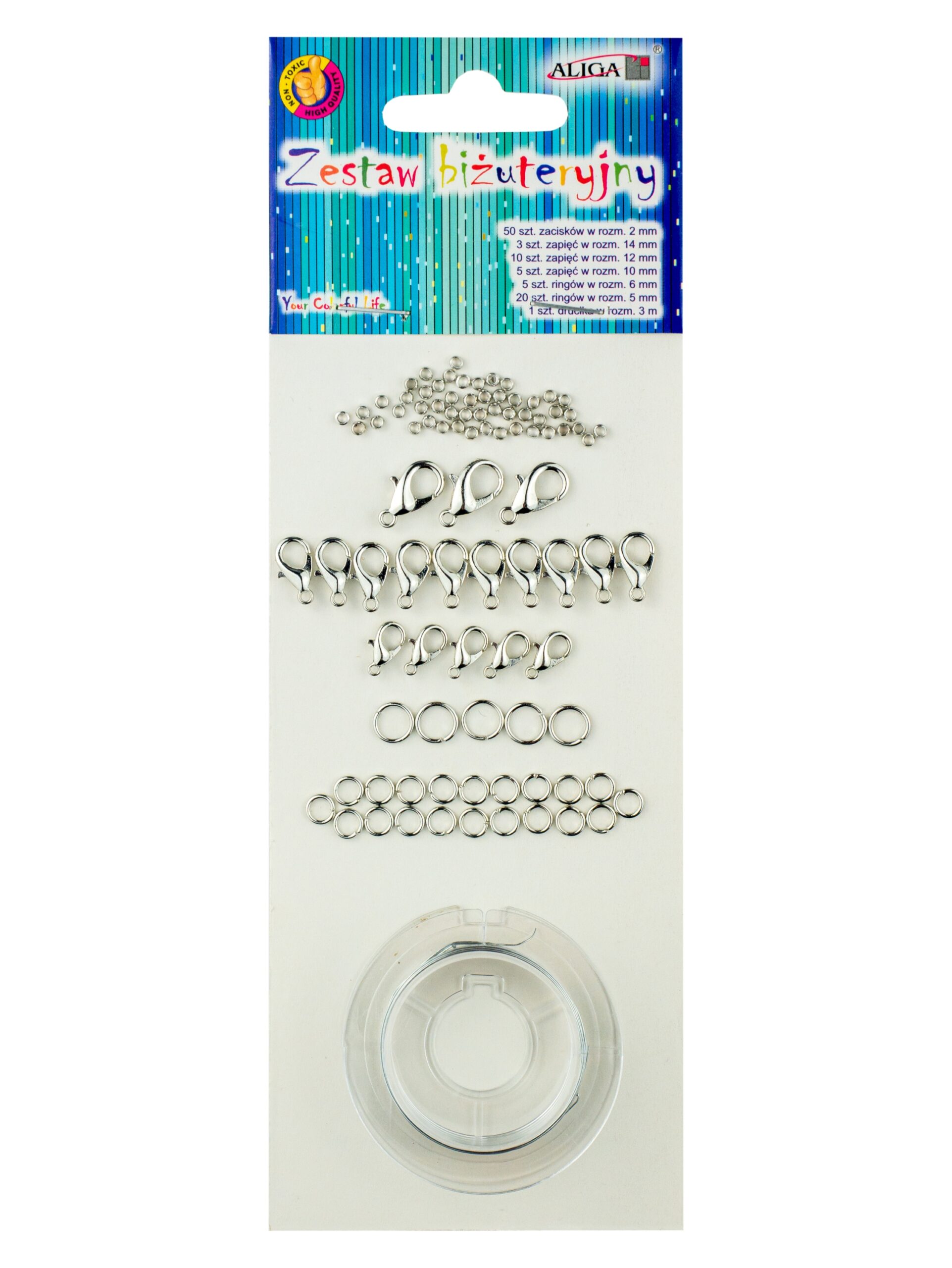 Zawiera 93 elementy: zaciski, zapięcia, ringi + żyłka elastyczna o długości 3m