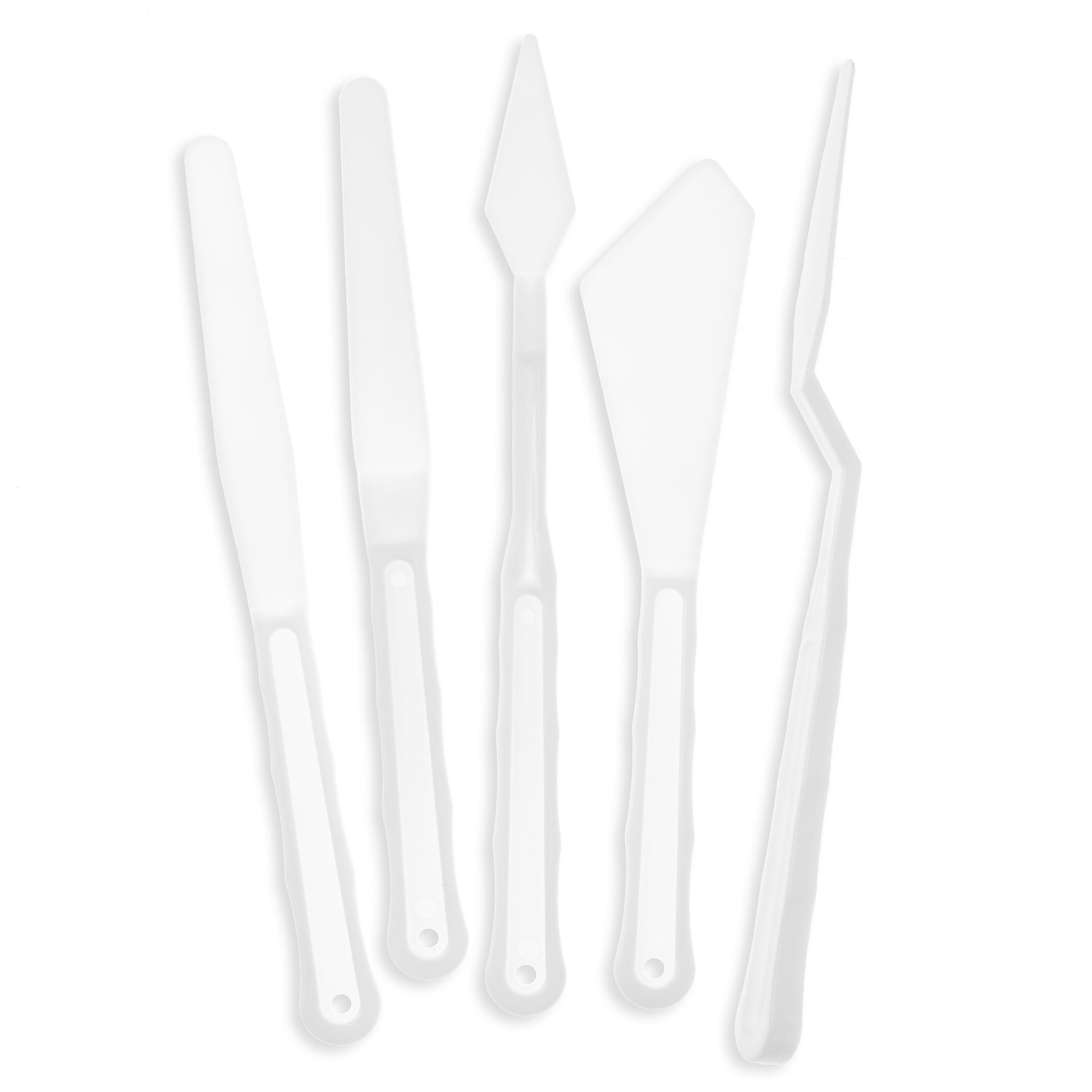 Zestaw szpachelek malarskich wykonanych z białego, giętkiego tworzywa. Przy ich pomocy można mieszać, nakładać oraz rozprowadzać farbę. Idealne do farb akrylowych, olejnych oraz tempery. Dzięki różnym wielkościom i kształtom można tworzyć nimi rozmaite struktury.